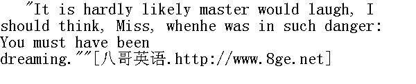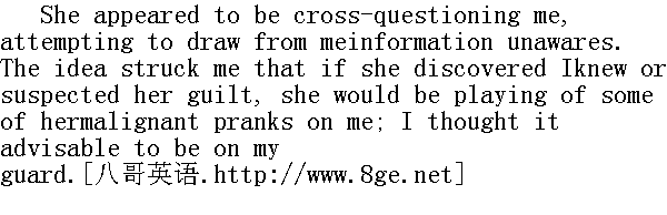 她似乎在盘问我,想在不知不觉中把我的话掏出来。我忽然想到,她要是发觉我知道或是怀疑她的罪行,就会恶意作弄我,我想还是警惕为妙。 "On the contrary," said I, "I bolted my door."" 恰恰相反,"我说,"我把门拴上了。" "Then you are not in the habit of bolting your door every nightbefore you get into bed?"" 那你每天睡觉之前没有拴门的习惯吗?" "Fiend! she wants to know my habits, that she may lay her plansaccordingly!" Indignation again prevailed over prudence: I repliedsharply, "Hitherto I have often omitted to fasten the bolt: I didnot think it necessary. I was not aware any danger or annoyance wasto be dreaded at Thornfield Hall: but in future" (and I laid markedstress on the words) "I shall take good care to make all securebefore I venture to lie down."" 这恶魔!她想知道我的习惯,好以此来算计我:"愤怒再次压倒谨慎,我尖刻地回答:"到目前为止我还是常常忽略了拴门,我认为没有这必要,我以前没有意识到在桑菲尔德还要担心什么危险或者烦恼,不过将来(我特别强调了这几个字),我要小心谨慎,弄得一切都安安全全了才敢躺下睡觉。" "It will be wise so to do," was her answer: "this neighbourhood isas quiet as any I know, and I never heard of the hall beingattempted by robbers since it was a house; though there are hundredsof pounds' worth of plate in the plate-closet, as is well known.And you see, for such a large house, there are very few servants,because master has never lived here much; and when he does come,being a bachelor, he needs little waiting on: but I always think itbest to err on the safe side; a door is soon fastened, and it is aswell to have a drawn bolt between one and any mischief that may beabout. A deal of people, Miss, are for trusting all to Providence;but I say Providence will not dispense with the means, though Heoften blesses them when they are used discreetly." And here sheclosed her harangue: a long one for her, and uttered with thedemureness of a Quakeress." 这样做才聪明呢,"她回答,"这一带跟我知道的任何地方都一样安静,打从府宅建成以来、我还没有听说过有强盗上门呢。尽管谁都知道,盘子柜里有价值几百英镑的盘子,而且你知道,老爷不在这里长住,就是来住,因为是单身汉也不大要人服侍,所以这么大的房子,只有很少几个仆人。不过我总认为过份注意安全总比不注意安全好,门一下子就能拴上,还是拴上门,把自己和可能发生的祸害隔开为好。小姐,很多人都把一切托付给上帝,但要我说呀,上帝不会排斥采取措施,尽管他只常常祝福那些谨慎采取的措施,"说到这里她结束了长篇演说。这番话对地来说是够长的了,而且口气里带着贵格会女教徒的假正经。