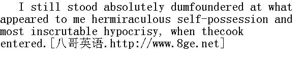 我依旧站在那里,正被她出奇的镇定和难以理解的虚伪弄得目瞪口呆时,厨师进门来了。 "Mrs. Poole," said she, addressing Grace, "the servants' dinner willsoon be ready: will you come down?"" 普尔太太,"她对格雷斯说,"佣人的午饭马上就好了,你下楼去吗?" "No; just put my pint of porter and bit of pudding on a tray, andI'll carry it upstairs."" 不啦,你就把我那一品特葡萄酒和一小块布丁放在托盘里吧,我会端到楼上去。" "You'll have some meat?"" 你还要些肉吗?" "Just a morsel, and a taste of cheese, that's all."" 就来一小份吧,再来一点奶酪,就这些。"