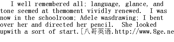 这一切我都记得清清楚楚:那语言,那眼神,那声调此刻似乎活生生地再现了。这时我呆在读书室里,阿黛勒在画画,我弯着身子指导她使用画笔,她抬起头,颇有些吃惊。 "Qu' avez-vous, mademoiselle?" said she. "Vos doigts tremblentcomme la feuille, et vos joues sont rouges: mais, rouges comme descerises!""Q'avez vous, Mademoiselle" 她说"Vos doigts tremblent comme la feuille,et vos joues sont rouges: mais, rouges comme des cerises!" "I am hot, Adele, with stooping!" She went on sketching; I went onthinking." 我很热,阿黛勒,这么躬着身!"她继续画她的速写,我继续我的思考。 I hastened to drive from my mind the hateful notion I had beenconceiving respecting Grace Poole; it disgusted me. I comparedmyself with her, and found we were different. Bessie Leaven hadsaid I was quite a lady; and she spoke truth--I was a lady. And nowI looked much better than I did when Bessie saw me; I had morecolour and more flesh, more life, more vivacity, because I hadbrighter hopes and keener enjoyments. 我急于要把对格雷斯.普尔的讨厌想法,从脑海中驱走,因为它使我感到厌恶,我把她与自己作了比较,发现彼此并不相同。贝茜.利文曾说我很有小姐派头。她说的是事实,我是一位小姐。而如今,我看上去已比当初贝茜见我时好多了。我脸色已更加红润,人已更加丰满,更富有生命力,更加朝气蓬勃,因为有了更光明的前景和更大的欢乐。 "Evening approaches," said I, as I looked towards the window. "Ihave never heard Mr. Rochester's voice or step in the house to-day;but surely I shall see him before night: I feared the meeting inthe morning; now I desire it, because expectation has been so longbaffled that it is grown impatient."" 黄昏快到了,"我朝窗子看了看,自言自语地说。"今天我还没有在房间里听到过罗切斯特先生的声音和脚步声呢。不过天黑之前我肯定会见到他。早上我害怕见面,而现在却渴望见面了。我的期望久久落空,真有点让人不耐烦了。"