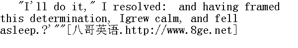 然后,拿出一块光滑的象牙来--你在画盒子里有一块备着:拿出你的调色板,把你最新、最漂亮、最明洁的色泽调起来,选择你最精细的骆驼毛画笔,仔细地画出你所能想象的最漂亮的脸蛋,根据费尔法克斯太太对布兰奇.英格拉姆的描绘,用最柔和的浓淡差别,最甜蜜的色泽来画。记住乌黑的头发,东方式的眸子--什么!你把罗切斯特先生作为模持儿,镇静!别哭鼻子!--不要感情用事!--不要反悔!我只能忍受理智和决心。回忆一下那庄重而和谐的面部特征,希腊式的脖子和胸部,露出圆圆的光彩照人的胳膊和纤细的手。不要省掉钻石耳环和金手镯。一丝不差地画下衣服、悬垂的花边、闪光的缎子、雅致的围巾和金色的玫瑰,把这幅肖像画题作'多才多艺的名门闺秀布兰奇。'"