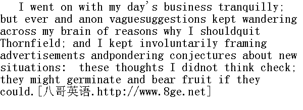 我平静地干着一天的工作。不过脑海中时时隐约闪过我要离开桑菲尔德的理由,我不由自主地设计起广告,预测起新的工作来。这些想法,我没有必要去制止,它们也许会生根发芽,还可能结出果子来。