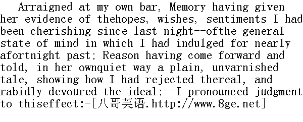 你,"我说,"得宠于罗切斯特先生吗?你有讨他欢心的天赋吗?你有哪一点对他来说举足轻重吗?滚开!你的愚蠢让我厌烦。而你却因为人家偶尔表示了喜欢便乐滋滋的,殊不知这是一个出身名门的绅士,一个精于世故的人对一个下属、一个初出毛庐的人所作的暧昧表示。你好大的胆子,愚蠢得可怜的受骗者。--难道想到自身的利益都不能让你聪明些吗?今天早上你反复叨念着昨夜的短暂情景啦?--蒙起你的脸,感到羞愧吧,他说了几句称赞你眼晴的话、是吗?盲目的自命不凡者,睁开那双模糊的眼睛,瞧瞧你自己该死的糊涂劲儿吧!受到无意与她结婚的上司的恭维,对随便哪个女人来说都没有好处。爱情之火悄悄地在内心点燃,得不到回报,不为对方所知,必定会吞没煽起爱的生命;要是被发现了,得到了回报,必定犹如鬼火,将爱引入泥泞的荒地而不能自拔。对所有的女人来说,那简直是发疯。"