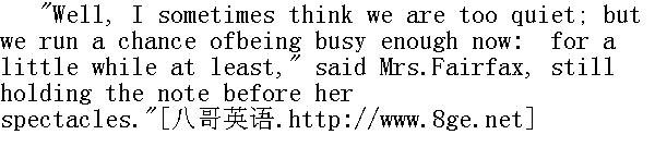 嗨,有时候我总认为太冷清,现在可有机会够我们忙了,至少得忙一会儿"费尔法克斯太太说,仍然把信纸举着放在眼镜前面。