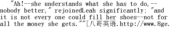呵,--她明白自己该干什么--没有人比得过她"莉娅意味深长地回答说,"不是谁都干得了她活的,就是给了同她一样多的钱也干不了。"