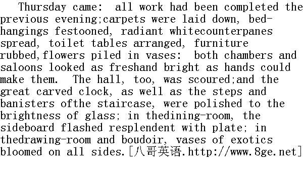 星期四到了,一切准备工作都已在前一个晚上完成。地毯铺开了,床幅挂上了彩条,白得眩目的床罩铺好了,梳妆台已经安排停当,家具都擦拭得干干净净,花瓶里插满了鲜花。卧室和客厅都已尽人工所能,拾掇得焕然一新;大厅也已经擦洗过,巨大的木雕钟,楼梯的台阶和栏杆都已擦得像玻璃一般闪闪发光。在餐室里,餐具柜里的盘子光亮夺目;在客厅和起居室内,一瓶瓶异国鲜花,在四周灿然开放。