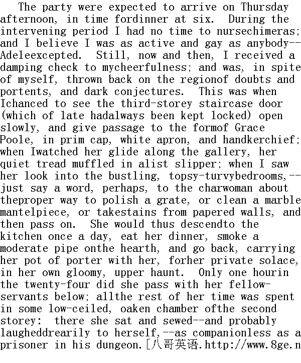 这批客人预计星期四下午到达,赶上六点钟吃晚饭。在等待期间我没有工夫去胡思乱想了。我想我跟其他人一样卖力、一样高兴--阿黛勒除外。不过我时时会感到扫兴,情不自禁地回想起那些疑惑、凶兆和不祥的猜测。那就是当我偶尔看到三楼楼梯的门慢悠悠地打开(近来常常锁着),格雷斯.普尔戴着整洁的帽子,系着围裙,揣着手帕,从那里经过时。我瞧着她溜过走廊,穿着布拖鞋,脚步声减低到很轻很轻。我看见她往闹哄哄乱糟糟的卧房里瞧了一瞧,只不过说一两句话,也许是给打杂女工们交代恰当的清扫方法:如何擦炉栅,如何清理大理石壁炉架,要不如何从糊了墙纸的墙上把缎子取下。说完便又往前走了。她一天下楼到厨房里走一次,来吃饭,在炉边有节制地吸一烟斗烟,随后就返回,带上一罐黑啤酒,在楼上阴暗的巢穴里独自消遣。一天二十四小时中,她只有一小时同楼下别的佣人呆在一起,其余时间是在三层楼上某个橡木卧室低矮的天花板下度过的。她坐在那里做着针线活--也许还兀自凄楚地大笑起来--像监狱里的犯人一样无人作伴。