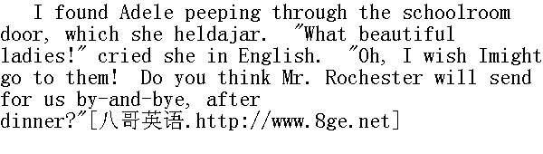 我看见阿黛勒扶着半掩的读书室门,往外偷看着。"多漂亮的小姐!"她用英语叫道。"哎呀我真想上她们那儿去!你认为晚饭后罗切斯特先生会派人来叫我们去吗?"