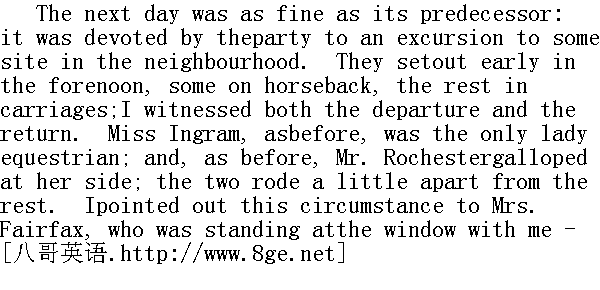 第二天跟第一天一样,是个晴朗的日子,客人们乘机到临近的某个地方去远足。他们上午很早就出发了,有的骑马,有的坐马车。我亲眼看着他们出发,看着他们归来。像以前一样,英格拉姆小姐是唯一一位女骑手。罗切斯特先生同她并驾齐驱。他们两人骑着马同其余的客人拉开了一段距离。费尔法克斯太太正与我一起站在窗前,我向她指出了这一点: