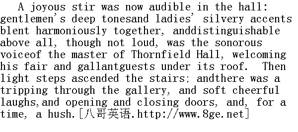 这时大厅里人声鼎沸,笑语纷纭。男士们深沉的语调,女士们银铃似的嗓音交融在一起。其中最清晰可辨的是桑菲尔德主人那洪亮而声音不大的嗓门,欢迎男女宾客来到府上。随后,这些人脚步轻盈地上了楼梯,轻快地穿过走廊。于是响起了柔和欢快的笑声和开门关门声。一会儿后,便寂然无声了。