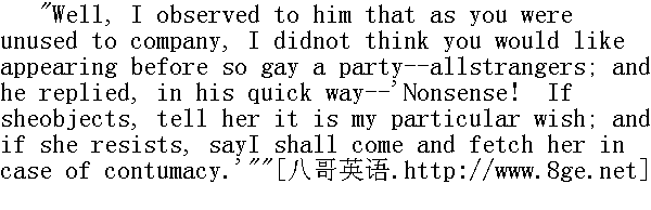 瞧,我对他说,你不习惯交往,所以我想你不会喜欢在一批轻松愉快而又都互不相识的宾客前露面,他还是那么急躁地回答说,'胡说八道!要是她不愿来,就告诉她这是我个人的意愿。如果她拒绝,你就说,她这么倔强,我要亲自来叫了。'" "I will not give him that trouble," I answered. "I will go, if nobetter may be; but I don't like it. Shall you be there, Mrs.Fairfax?"" 我不愿给他添那么多麻烦",我回答。"要是没有更好的办法了,我就去。不过我并不喜欢。你去吗,费尔法克斯太太?" "No; I pleaded off, and he admitted my plea. I'll tell you how tomanage so as to avoid the embarrassment of making a formal entrance,which is the most disagreeable part of the business. You must gointo the drawing-room while it is empty, before the ladies leave thedinner-table; choose your seat in any quiet nook you like; you neednot stay long after the gentlemen come in, unless you please: justlet Mr. Rochester see you are there and then slip away--nobody willnotice you."" 不,我请求免了,他同意了。一本正经入场是最不好受的,我来告诉你怎样避免这种尴尬,你得在女士们离席之前,客厅里还没有人的时候就进去,找个僻静的角落坐下。男宾们进来之后,你不必呆得很久,除非你高兴这么做。你不过是让罗切斯特先生看到你在那里,随后你就溜走--没有人会注意到你。" "Will these people remain long, do you think?"" 你认为这批客人会呆得很久吗?" "Perhaps two or three weeks, certainly not more. After the Easterrecess, Sir George Lynn, who was lately elected member for Millcote,will have to go up to town and take his seat; I daresay Mr.Rochester will accompany him: it surprises me that he has alreadymade so protracted a stay at Thornfield."" 也许两三个星期,肯定不会再久了。过了复活节假期,乔治.林恩爵士由于新近当上了米尔科特市议员,得去城里就职。我猜想罗切斯特先生会同他一起去。我觉得很奇怪,这回他在桑菲尔德呆了那么长时间。"
