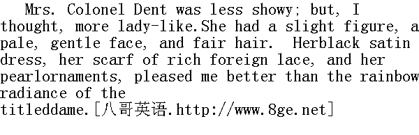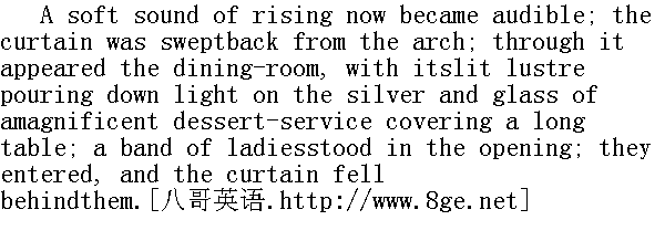 这时响起了轻轻的起立声,帐幔被撩到了拱门背后,露出了餐室,只见长长的桌上摆满了盛甜点心的豪华餐具,烛光倾泻在银制的和玻璃的器皿上。一群女士站在门口。随后她们走了进来,门帘在身后落下。 There were but eight; yet, somehow, as they flocked in, they gavethe impression of a much larger number. Some of them were verytall; many were dressed in white; and all had a sweeping amplitudeof array that seemed to magnify their persons as a mist magnifiesthe moon. I rose and curtseyed to them: one or two bent theirheads in return, the others only stared at me. 她们不过八位,可不知怎地,成群结队进来的时候,给人的印象远不止这个数目。有些个子很高,有些一身著白。她们的服装都往外伸展得很阔,仿佛雾气放大了月亮一样,这些服装也把她们的人放大了。我站起来向她们行了屈膝礼,有一两位点头回礼,而其余的不过盯着我看而已。 They dispersed about the room, reminding me, by the lightness andbuoyancy of their movements, of a flock of white plumy birds. Someof them threw themselves in half-reclining positions on the sofasand ottomans: some bent over the tables and examined the flowersand books: the rest gathered in a group round the fire: all talkedin a low but clear tone which seemed habitual to them. I knew theirnames afterwards, and may as well mention them now. 她们在房间里散开,动作轻盈飘拂,令我想起了一群白色羽毛的鸟。有些人一下子坐下来,斜倚在沙发和卧榻上;有的俯身向着桌子,细细揣摩起花和书来,其余的人则团团围着火炉。大家都用低沉而清晰的调子交谈着,似乎这已成了她们的习惯。后来我知道了她们的大名,现在不妨来提一下。 First, there was Mrs. Eshton and two of her daughters. She hadevidently been a handsome woman, and was well preserved still. Ofher daughters, the eldest, Amy, was rather little: naive, andchild-like in face and manner, and piquant in form; her white muslindress and blue sash became her well. The second, Louisa, was tallerand more elegant in figure; with a very pretty face, of that orderthe French term minois chiffone: both sisters were fair as lilies. 首先是埃希顿太太和她的两个女儿。她显然曾是位漂亮的女人,而且保养得很好。她的大女儿艾米个头比较小,有些天真,脸部和举止都透出了孩子气,外表也显得很调皮。她那白色的薄纱礼服和蓝色的腰带很合身。二女儿路易莎的个子要高些,身材也更加优美,脸长得很不错,属于法国人所说的"minoischiffonne"那一类,姐妹俩都像百合花那么白净。 Lady Lynn was a large and stout personage of about forty, veryerect, very haughty-looking, richly dressed in a satin robe ofchangeful sheen: her dark hair shone glossily under the shade of anazure plume, and within the circlet of a band of gems. 林恩夫人四十岁上下,长得又大又胖,腰背笔直,一脸傲气,穿着华丽的闪缎衣服。乌黑的头发在一根天蓝色羽毛和一圈宝石的映衬下闪闪发光。