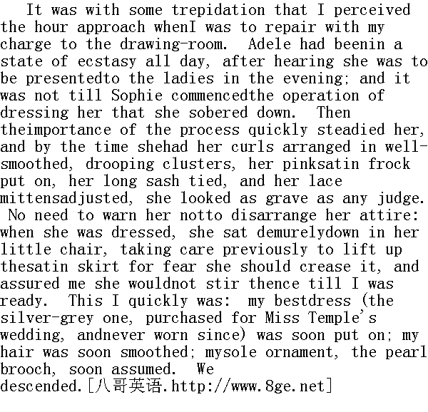 眼看我带着照管的孩子进客厅的时刻就要到来,我心里惴惴不安。阿黛勒听说晚上要去见女士们,便整天处于极度兴奋状态,直到索菲娅开始给她打扮,才安静下来。随后更衣的重要过程很快稳定了她的情绪。待到她卷发梳得溜光,一束束垂着,穿上了粉红色的缎子罩衣,系好长长的腰带,戴上了网眼无指手套,她看上去已是像任何一位法官那么严肃了。这时已没有必要提醒她别弄乱自己的服装,她穿戴停当后,便安静地坐在小椅子上,急忙小心地把缎子裙提起来,唯恐弄皱了。还向我保证,她会一动不动坐在那里,直到我准备好为止。我很快就穿戴好了。我立即穿上了自己最好的衣服(银灰色的那一件,专为参加坦普尔小姐的婚礼购置的,后来一直没有穿过),把头发梳得平平伏伏,并戴上了我仅有的饰品,那枚珍珠胸针。随后我们下了楼。 Fortunately there was another entrance to the drawing-room than thatthrough the saloon where they were all seated at dinner. We foundthe apartment vacant; a large fire burning silently on the marblehearth, and wax candles shining in bright solitude, amid theexquisite flowers with which the tables were adorned. The crimsoncurtain hung before the arch: slight as was the separation thisdrapery formed from the party in the adjoining saloon, they spoke inso low a key that nothing of their conversation could bedistinguished beyond a soothing murmur. 幸亏还有另外一扇门通客厅,不必经过他们都坐着吃饭的餐厅。我们看到房间里空无一人,大理石砌成的壁炉中,一堆旺火静静地燃烧着;桌上装饰着精致的花朵,烛光在花朵中间孤寂地闪亮,平添了几分欢快。拱门前悬挂着大红门帘,虽然我们与毗连的餐室中的客人之间,仅一层之隔,但他们话说得那么轻,除了柔和的嗡嗡声,彼此之间的交谈一点都听不清楚。 Adele, who appeared to be still under the influence of a mostsolemnising impression, sat down, without a word, on the footstool Ipointed out to her. I retired to a window-seat, and taking a bookfrom a table near, endeavoured to read. Adele brought her stool tomy feet; ere long she touched my knee. 阿黛勒似乎仍受着严肃气氛的震慑,一声不吭地坐在我指给她的小凳上。我退缩在一个靠窗的位置上,随手从临近的台子上取了本书,竭力读下去。阿黛勒把她的小凳子搬到我脚边,不久便碰了碰我膝头。 "What is it, Adele?"" 怎么啦,阿黛勒?" "You think too much of your 'toilette,' Adele: but you may have aflower." And I took a rose from a vase and fastened it in her sash.She sighed a sigh of ineffable satisfaction, as if her cup ofhappiness were now full. I turned my face away to conceal a smile Icould not suppress: there was something ludicrous as well aspainful in the little Parisienne's earnest and innate devotion tomatters of dress." 你对自己的'toilette'想得太多啦,阿黛勒,不过你可以戴一朵花。"于是我从花瓶里掐下一朵花来,系在她的彩带上,她舒了口气,显出一种不可言喻的满足,仿佛她的幸福之杯此刻已经斟满了。我转过脸去,掩饰自己抑制不住的微笑。在这位巴黎小女子天生对服饰的热烈追求中,既有几分可笑,又有几分可悲。