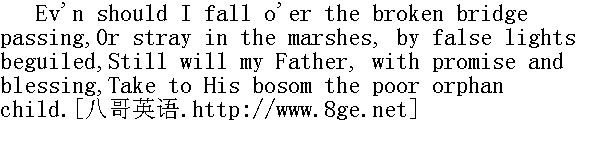 哪怕我走过断桥失足坠落,或是在迷茫恍惚中误入泥淖。天父啊,你带着祝福与许诺,把可怜的孤儿搂入你怀抱。 There is a thought that for strength should avail me,Though both of shelter and kindred despoiled;Heaven is a home, and a rest will not fail me;God is a friend to the poor orphan child." 哪怕我无家可归无亲无故,一个给人力量的信念在我心头。天堂啊,永远是归宿和安息之所,上帝是可怜孤儿的朋友。 "Come, Miss Jane, don't cry," said Bessie as she finished. Shemight as well have said to the fire, "don't burn!" but how could shedivine the morbid suffering to which I was a prey? In the course ofthe morning Mr. Lloyd came again." 来吧,简小姐,别哭了,"贝茜唱完了说。其实,她无异于对火说"你别燃烧!"不过,她怎么能揣度出我被极度的痛苦所折磨?早上劳埃德先生又来了。 "What, already up!" said he, as he entered the nursery. "Well,nurse, how is she?"" 怎么,己经起来了!"他一进保育室就说,"嗨,保姆、她怎么样了?" Bessie answered that I was doing very well. 贝茜回答说我情况很好。