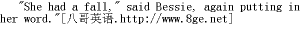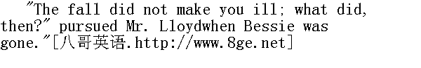 她跌了一跤。"贝茜又插嘴了。 "Fall! why, that is like a baby again! Can't she manage to walk ather age? She must be eight or nine years old."" 跌交:又耍娃娃脾气了!她这样年纪还不会走路?八九岁总有了吧。" "I was knocked down," was the blunt explanation, jerked out of me byanother pang of mortified pride; "but that did not make me ill," Iadded; while Mr. Lloyd helped himself to a pinch of snuff." 我是被人给打倒的,"我脱口而出。由于自尊心再次受到伤害,引起了一阵痛楚,我冒昧地作了这样的辩解。"但光那样也不会生病。"我趁劳埃德先生取了一撮鼻烟吸起来时说。 As he was returning the box to his waistcoat pocket, a loud bellrang for the servants' dinner; he knew what it was. "That's foryou, nurse," said he; "you can go down; I'll give Miss Jane alecture till you come back." 他把烟盒放入背心口袋。这时,铃声大作,叫佣人们去吃饭。他明白是怎么回事。"那是叫你的,保姆,"他说,"你可以下去啦,我来开导开导简小姐,等着你回来," Bessie would rather have stayed, but she was obliged to go, becausepunctuality at meals was rigidly enforced at Gateshead Hall. 贝茜本想留着,但又不得不走,准时吃饭是盖茨黑德府的一条成规。