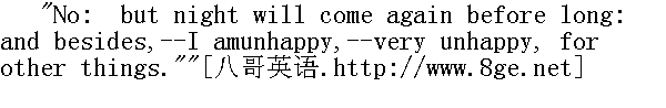 现在不怕,不过马上又要到夜里了。另外,我不愉快,很不愉快,为的是其他事情。" "What other things? Can you tell me some of them?"" 其他什么事?能说些给我听听吗?" How much I wished to reply fully to this question! How difficult itwas to frame any answer! Children can feel, but they cannot analysetheir feelings; and if the analysis is partially effected inthought, they know not how to express the result of the process inwords. Fearful, however, of losing this first and only opportunityof relieving my grief by imparting it, I, after a disturbed pause,contrived to frame a meagre, though, as far as it went, trueresponse. 我多么希望能原原本本回答这个问题!要作出回答又何其困难:孩子们能够感觉,但无法分析自己的情感,即使部分分折能够意会,分析的过程也难以言传。但是我又担心失去这第一次也是唯一一次吐苦水的机会。所以局促不安地停了一停之后,便琢磨出一个虽不详尽却相当真实的回答。 "For one thing, I have no father or mother, brothers or sisters."" 一方面是因为我没有父母,没有兄弟姐妹的缘故。" "You have a kind aunt and cousins."" 可是你有一位和蔼可亲的舅母,还有表兄妹们。"