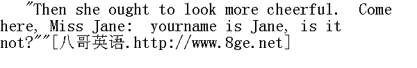 那她应该高兴才是。过来、简小姐,你的名字叫简,是不是?" "Yes, sir, Jane Eyre."" 是,先生,叫简·爱。" "Well, you have been crying, Miss Jane Eyre; can you tell me whatabout? Have you any pain?"" 瞧,你一直在哭,简·爱小姐,你能告诉我为什么吗?哪儿疼吗?" "No, sir."" 不疼,先生。" "Oh! I daresay she is crying because she could not go out withMissis in the carriage," interposed Bessie." 啊,我想是因为不能跟小姐们一起坐马车出去才哭的,"贝茜插嘴说。