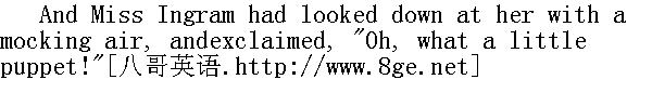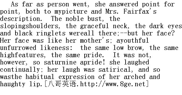 就外貌而言,她各方面都与我的画和费尔法克斯太太的描绘相吻合。高高的胸部、倾斜的肩膀、美丽的颈项、乌黑的眸子和黑油油的卷发,一应俱全--但她的脸呢?一-活象她母亲的,只是年青而没有皱纹。一样低低的额角,一样高傲的五官,一样盛气凌人。不过她的傲慢并不那么阴沉。她常常笑声不绝,而且笑里含着嘲弄,这也是她那弯弯的傲气十足的嘴唇所常有的表情。 Genius is said to be self-conscious. I cannot tell whether MissIngram was a genius, but she was self-conscious--remarkably self-conscious indeed. She entered into a discourse on botany with thegentle Mrs. Dent. It seemed Mrs. Dent had not studied that science:though, as she said, she liked flowers, "especially wild ones;" MissIngram had, and she ran over its vocabulary with an air. Ipresently perceived she was (what is vernacularly termed) TRAILINGMrs. Dent; that is, playing on her ignorance--her TRAIL might beclever, but it was decidedly not good-natured. She played: herexecution was brilliant; she sang: her voice was fine; she talkedFrench apart to her mamma; and she talked it well, with fluency andwith a good accent. 据说天才总有很强的自我意识。我无法判断英格拉姆小姐是不是位天才,但是她有自我意识--说实在相当强。她同温文而雅的登特太太谈起了植物。而登特太太似乎没有研究过那门学问,尽管她说喜爱花卉,"尤其是野花"。英格拉姆小姐却是研究过的,而且还神气活现地卖弄植物学字眼,我立刻觉察到她在追猎(用行话来表达)登特太太,也就是说,在戏弄她的无知。她的追猎也许很讥诮,但决非厚道。她弹了钢琴,她的演技很高超;她唱了歌,她的嗓子很优美;她单独同她妈妈讲法语,她讲得很出色,非常流利,语调也正确。 Mary had a milder and more open countenance than Blanche; softerfeatures too, and a skin some shades fairer (Miss Ingram was dark asa Spaniard)--but Mary was deficient in life: her face lackedexpression, her eye lustre; she had nothing to say, and having oncetaken her seat, remained fixed like a statue in its niche. Thesisters were both attired in spotless white. 与布兰奇相比,玛丽的面容显得更温顺坦率,五官更为柔和,皮肤也要白皙几分(英格拉姆小姐像西班牙人一样黑)--但玛丽缺乏活力,面部少有表情,眼目不见光泽。她无话可说,一坐下来,便像壁龛里的雕像那样,一动不动。姐妹俩都穿着一尘不染的素装。 And did I now think Miss Ingram such a choice as Mr. Rochester wouldbe likely to make? I could not tell--I did not know his taste infemale beauty. If he liked the majestic, she was the very type ofmajesty: then she was accomplished, sprightly. Most gentlemenwould admire her, I thought; and that he DID admire her, I alreadyseemed to have obtained proof: to remove the last shade of doubt,it remained but to see them together. 那么,我现在是不是认为,英格拉姆小姐有可能成为罗切斯特先生的意中人呢?我说不上来--我不了解他在女性美方面的好恶。要是他喜欢端庄,她正是端庄的典型,而且她多才多艺,充满活力。我想多数有身份的人都会倾慕她,而他确实倾慕她,我似乎已有依据。要消除最后的一丝怀疑,就只要看他们呆在一起时的情景就行了。 You are not to suppose, reader, that Adele has all this time beensitting motionless on the stool at my feet: no; when the ladiesentered, she rose, advanced to meet them, made a stately reverence,and said with gravity - 读者呵,你别以为阿黛勒始终在我脚边的小凳子上端坐不动,她可不是。女士们一进来,她便站起来,迎了上去,端端正正鞠了一躬,并且一本正经地说: