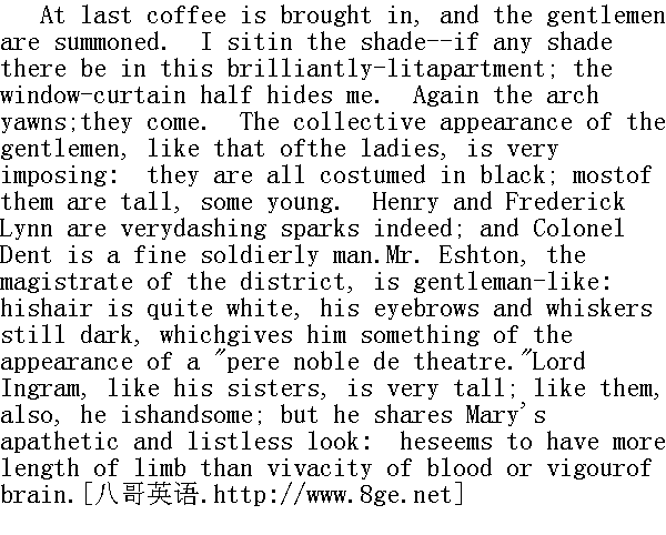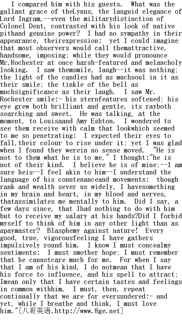 最后端上了咖啡,男宾们都被请了进来。要是这个灯火辉煌的房间还有什么幽暗所在的话,那我就坐在暗处,被窗帘半掩着。拱门的帐幔再次撩起,他们进来了。男士们一起登场时的情景,同女宾们一样气派非凡。他们齐煞煞的都着黑色服装,多数身材高大,有的十分年轻。亨利.林恩和弗雷德里克.林恩确实精神抖擞,生气勃勃;登特上校一身英武之气;地方法官埃希顿先生一付绅士派头,头发相当白,眉毛和络腮胡子却依然乌黑,使他有几分像'perenobledetheatre"。英格拉姆勋爵同他的姐妹们一样高挑个子,同她们一样漂亮,但有着玛丽那种冷漠、倦怠的神色。他似乎四肢瘦长有余,血气或脑力不足。 And where is Mr. Rochester? 那么,罗切斯特先生在哪儿呢? He comes in last: I am not looking at the arch, yet I see himenter. I try to concentrate my attention on those netting-needles,on the meshes of the purse I am forming--I wish to think only of thework I have in my hands, to see only the silver beads and silkthreads that lie in my lap; whereas, I distinctly behold his figure,and I inevitably recall the moment when I last saw it; just after Ihad rendered him, what he deemed, an essential service, and he,holding my hand, and looking down on my face, surveyed me with eyesthat revealed a heart full and eager to overflow; in whose emotionsI had a part. How near had I approached him at that moment! Whathad occurred since, calculated to change his and my relativepositions? Yet now, how distant, how far estranged we were! So farestranged, that I did not expect him to come and speak to me. I didnot wonder, when, without looking at me, he took a seat at the otherside of the room, and began conversing with some of the ladies. 他最后一个进来,虽然我没有朝拱门张望,但看到他进来了。我竭力要把注意力集中在钩针上,集中在编织出来的手提包网眼上--真希望自己只想手头的活计,只看见膝上的银珠和丝线;而我却清清楚楚地看到了他的身影,禁不住忆起了上次见到这身影时的情景,那是在他所说的帮了他大忙以后,--他拉住我的手,低首看着我的脸,细细端详着我,眼神里露出一种千言万语急于一吐为快的心情,而我也有同感。在那一瞬间我同他靠得多近!自那以后,什么事情刻意使他和我的地位起了变化呢?而现在,我们之间的关系变得多么疏远,多么陌生呀!我们己那么隔膜,因此我并不指望他过来同我说话。我也并不感到诧异,他居然连看都不看我一眼就在房间另一头坐下,开始同一些女士们交谈起来。 No sooner did I see that his attention was riveted on them, and thatI might gaze without being observed, than my eyes were drawninvoluntarily to his face; I could not keep their lids undercontrol: they would rise, and the irids would fix on him. Ilooked, and had an acute pleasure in looking,--a precious yetpoignant pleasure; pure gold, with a steely point of agony: apleasure like what the thirst-perishing man might feel who knows thewell to which he has crept is poisoned, yet stoops and drinks divinedraughts nevertheless. 我一见他心思全在她们身上,而我可以瞪着他而不被觉察,我的目光便不由自主地被吸引到了他的脸上。我无法控制我的眼皮,它们硬要张开,眼珠硬要盯着他。我瞧着,这给了我一种极度的欢乐,--一种宝贵而辛辣的欢乐;是纯金,却又夹杂着痛苦的钢尖。像一个渴得快死的人所体会到的欢乐,明知道自己爬近的泉水已经下了毒,却偏要俯身去喝那圣水。 Most true is it that "beauty is in the eye of the gazer." Mymaster's colourless, olive face, square, massive brow, broad andjetty eyebrows, deep eyes, strong features, firm, grim mouth,--allenergy, decision, will,--were not beautiful, according to rule; butthey were more than beautiful to me; they were full of an interest,an influence that quite mastered me,--that took my feelings from myown power and fettered them in his. I had not intended to love him;the reader knows I had wrought hard to extirpate from my soul thegerms of love there detected; and now, at the first renewed view ofhim, they spontaneously arrived, green and strong! He made me lovehim without looking at me." 情人眼里出美人,"说得千真万确。我主人那没有血色、微榄色的脸、方方的大额角、宽阔乌黑的眉毛、深沉的眼睛、粗线条的五官、显得坚毅而严厉的嘴巴--一切都诱出活力、决断和意志--按常理并不漂亮,但对我来说远胜于漂亮。它们充溢着一种情趣和影响力,足以左右我,使我的感情脱离我的控制,而受制于他。我本无意去爱他。读者知道,我努力从自己内心深处剪除露头的爱的萌芽,而此刻,一旦与他重新谋面,那萌芽又自动复活了,变得碧绿粗壮!他连看都不用看我就使我爱上了他。