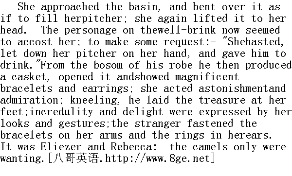 她走近大盆子,俯身似乎要把水坛灌满。随后再次把坛子举起来放在头上。那个在井边的人好像在同他打招呼,提出了某种要求:她"就急忙拿下瓶来,托在手上给他喝。"随后他从胸口的长袍里,取出一个盒子,打了开来,露出金灿灿的镯子和耳环;她做出惊叹的表情,跪了下来。他把珠宝搁在她脚边,她的神态和动作中流露出疑惑与喜悦,陌生人替她戴好了手镯,挂好了耳环。这就是以利以泽和利百加了,只不过没有骆驼。