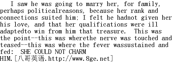 我看到他要娶她是出于门第观念,也许还有政治上的原因,因为她的地位与家庭关系同他很相配。我觉得他并没有把自己的爱给她,她也没有资格从他那儿得到这个宝物。这就是问题的症结--就是触及痛处的地方--就是我热情有增无减的原因:因为她不可能把他迷住。