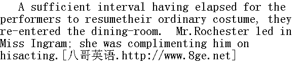 随后是一段充分的休息时间,让表演者恢复原来的服装,他们再次走进餐室。罗切斯特先生领着英格拉姆小姐,她正夸奖着他的演技。