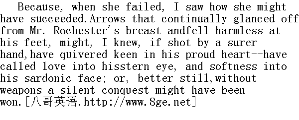 她失败时,我知道她本可以取胜。我知道,那些不断擦过罗切斯特先生的胸膛,没有射中落在脚下的箭,要是由一个更为稳健的射手来射,满可以在他高傲的心坎上剧烈颤动--会在他严厉的目光中注入爱,在嘲弄的面部表情中注入柔情,或者更好,不需要武器便可无声把他征服。