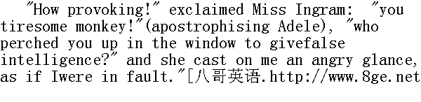 真恼人!"英格拉姆小姐嚷道:"你这个讨厌的猴子!"(称呼阿黛勒)"谁将你弄上窗子谎报消息的?"她怒悻悻地瞥了我一眼,仿佛这是我的过错。
