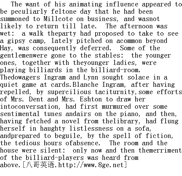 一天,他有事上米尔科特去了,要很晚才能回来,大家便特别感觉到缺少了他生气勃勃的感染力。那天下午下了雨,结果原来计划好的,徒步去看新近扎在海村工地上的吉卜赛人营房的事,也就推迟了。一些男士们去了马厩,年青一点的与小姐们一起在台球房里打台球。遗孀英格拉姆和林恩,安静地玩纸牌解闷。登特太太和埃希顿太太拉布兰奇.英格拉姆小姐一起聊天,她爱理不理地拒绝了,自己先是伴着钢琴哼了一些感伤的曲调,随后从图书室里拿了本小说,傲气十足却无精打彩地往沙发上一坐,准备用小说的魅力,来消磨几个钟头无人作伴的乏味时光。除了不时传来楼上玩台球人的欢叫,整个房间和整所房子都寂静无声。