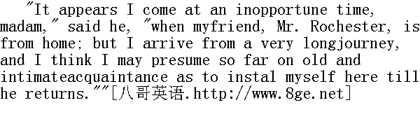 看来我来得不是时候,夫人,"他说,"正巧我的朋友罗切斯特先生出门去了,可是我远道而来,我想可以作为关系密切的老相识,冒昧在这儿呆一下,等到他回来。"