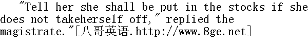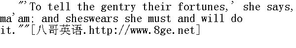 不--慢着!"登特上校打断了他。"别把她打发走,埃希顿。我们也许可以利用这件事,还是同女士们商量一下吧。"随后大着嗓门继续说道:"女士们,你们不是说起要去海村工地看一下吉卜赛人营地吗,这会儿萨姆说,现在有位本奇妈妈在仆人的饭厅里,硬要让人带到"有身份"的人面前,替他们算算命。你们愿意见她吗?'"