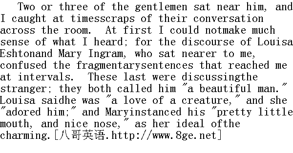 两三位男士坐在他旁边,我听到了他们在房间另一头谈话的片断。起初我听不大懂,因为路易莎.埃希顿和玛丽.英格拉姆离我更近,她们的谈话使断断续续到我耳边的片言只语模糊不清。路易莎和玛丽两人在谈论着陌生人,都称他为"美男子"。路易莎说他是位"可爱的家伙"而且"喜欢他",玛丽列举了"他的小嘴巴和漂亮鼻子",认为是她心目中理想的魅力所在。