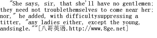 她说,先生,她不见男士,他们不必费心去接近她了,还有,"他好不容易忍住不笑出声来,补充道"女士们除了年轻单身的也不必见了。"
