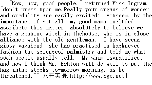 好了,好了,你们这些好人,"英格拉姆小姐回答道"别硬逼我了,你们的那些主管惊讶和轻信的器官,也实在太容易给激发起来了。你们大家--也包括我的好姐姐--都那么重视这件事--似乎绝对相信这屋子里真有一个与恶魔勾结的巫婆。我见过一个吉卜赛流浪者,她用陈腐的方法操弄着手相术,告诉我她们那些人往往会怎样给人算命。我已经过了解,现在我想埃希顿先生会像他恫吓过的那样,行个好,明天一早把这个丑老婆子铐起来。"