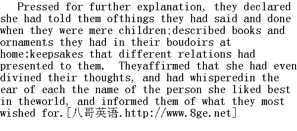 众人缠住她们,要求细说。她们便说,这算命的讲了些她们小时候说过的话,做过的事;描绘了她们家中闺房里所拥有的书和装饰品,不同亲戚分赠给她们的纪念品。她们断定她甚至摸透了她们的想法,在每个人的耳边悄声说出她最喜欢的人的名字,告诉她们各人的夙愿。