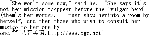 她现在不来了,"他说。"她说了她的使命不是到'一群庸人(她的话)面前来的。我得带她独个儿进一个房间,然后,想要请教她的人得一个一个去。'"