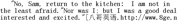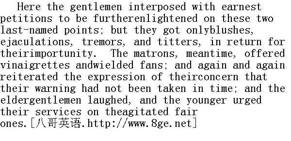 说到这里,男客们插嘴了,急急乎请求她们对最后谈到的两点,进一步透露一下。然而面对这些人的纠缠,她们颤栗着脸涨得通红,又是叫呀又是笑。同时太太们递上了香嗅瓶,摇起扇来,还因为没有及时接受她们的劝告,而一再露出不安的表情。年长的男士们大笑不止,年青的赶紧去给美丽的女士压惊。 In the midst of the tumult, and while my eyes and ears were fullyengaged in the scene before me, I heard a hem close at my elbow: Iturned, and saw Sam. 在这一片混乱之中,我的耳目被眼前的情景所吸引。这时我听见身旁有人清了清嗓子,回头一看,见是萨姆。 "If you please, miss, the gipsy declares that there is another youngsingle lady in the room who has not been to her yet, and she swearsshe will not go till she has seen all. I thought it must be you:there is no one else for it. What shall I tell her?"" 对不起,小姐,吉卜赛人说,房子里还有一位未婚年青女士没有去见她,她发誓不见到所有的人就不走。想必这就是你,没有其他人了。我怎么去回话呢?" "Oh, I will go by all means," I answered: and I was glad of theunexpected opportunity to gratify my much-excited curiosity. Islipped out of the room, unobserved by any eye--for the company weregathered in one mass about the trembling trio just returned--and Iclosed the door quietly behind me." 呵,我一定去,"我回答。我很高兴能有这个意外的机会满足我大大激起了的好奇心。我溜出房间,谁也没有看到我--因为众人聚在一起,围着刚回来依然哆嗦着的三个人--随手轻轻地关上门。 "If you like, miss," said Sam, "I'll wait in the hall for you; andif she frightens you, just call and I'll come in."" 对不起,小姐,"萨姆说,"我在厅里等你,要是她吓着你了,你就叫一下,我会进来的。"
