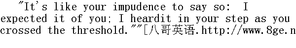 说话这么无礼倒是你的脾性,我料定你会这样,你跨过门槛的时候,我从你的脚步声里就听出来了。" "Did you? You've a quick ear."" 是吗?你的耳朵真尖。" "I have; and a quick eye and a quick brain."" 不错,而且眼睛亮,脑子快。" "You need them all in your trade."" 干你这一行倒是都需要的。" "I do; especially when I've customers like you to deal with. Whydon't you tremble?"" 我是需要的,尤其是对付像你这样的顾客的时候。你干嘛不发抖?"