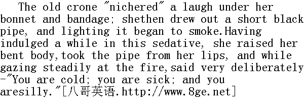 这老太婆在帽子和带子底下爆发出了一阵笑声。随后取出一个短短的烟筒,点上烟,开始抽了起来。她在这份镇静剂里沉迷了一会儿后,便直起了弯着的腰,从嘴里取下烟筒,一面呆呆地盯着炉火,一面不慌不忙地说:"你很冷;你有病;你很傻。" "Prove it," I rejoined." 拿出证据来,"我回答, "I will, in few words. You are cold, because you are alone: nocontact strikes the fire from you that is in you. You are sick;because the best of feelings, the highest and the sweetest given toman, keeps far away from you. You are silly, because, suffer as youmay, you will not beckon it to approach, nor will you stir one stepto meet it where it waits you."" 一定,三言两语就行。你很冷,因为你孤身一人,没有交往,激发不了内心的火花。你病了,因为给予男人的最好、最高尚、最甜蜜的感情,与你无缘。你很傻,因为尽管你很痛苦,你却既不会主动去召唤它靠近你,也不会跨出一步,上它等候你的地方去迎接它。" She again put her short black pipe to her lips, and renewed hersmoking with vigour. 她再次把那杆黑色的短烟筒放进嘴里,使劲吸了起来。 "You might say all that to almost any one who you knew lived as asolitary dependent in a great house."" 凡是你所知道寄居在大房子里的孤独者,你几乎都可以说这样的话。"