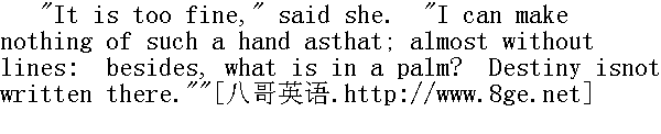 太细嫩了,"她说。"这样的手我什么也看不出来,几乎没有皱纹。况且,手掌里会有什么呢?命运又不刻在那儿。" "I believe you," said I." 我相信你,"我说。 "No," she continued, "it is in the face: on the forehead, about theeyes, in the lines of the mouth. Kneel, and lift up your head."" 不,"她继续说,"它刻在脸上,在额头,在眼睛周围,在眸子里面,在嘴巴的线条上。跪下来,抬起你的头来。"
