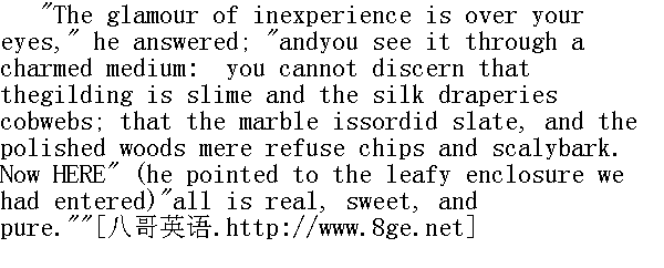 天真烂漫所造成的魔力蒙住了你的眼睛,"他回答说。"你是用着了魔的眼光来看它的,你看不出镀的金是粘土;丝绸帐幔是蛛网;大理石是污秽的石板;上光的木器不过是废木屑和烂树皮。而这里(他指着我们踏进的树叶繁茂的院落)一切都那么纯真香甜。"