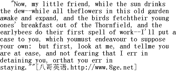 好吧,我的小朋友,当太阳吸吮着雨露--当老园子里的花统统苏醒并开放,鸟儿飞越桑菲尔德为雏鸟送来早餐,早起的蜜蜂开始了它们第一阵劳作时--我要把这件事诉说给你听,你务必要努力把它设想成自己的。不过先看着我,告诉我你很平静,并不担心我把你留着是错的,或者你呆着是不对的。"