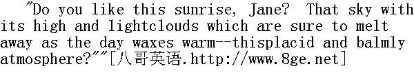 你喜欢日出吗,简?喜欢天空,以及天气一暖和就消失的高高的轻云吗?--喜欢这宁静而温馨的气氛吗?"