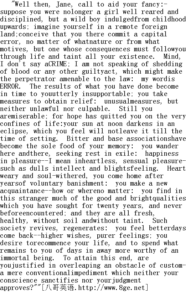 那么好吧,简,发挥你的想象力吧--设想你不再是受过精心培养和教导的姑娘,而是从幼年时代起就是一个放纵任性的男孩。想象你身处遥远的异国,假设你在那里铸成了大错,不管其性质如何,出于什么动机,它的后果殃及你一生,玷污你的生活。注意,我没有说'犯罪',不是说流血或是其他犯罪行为,那样的话肇事者会被绳之以法,我用的字是'错误'。你行为的恶果,到头来使你绝对无法忍受。你采取措施以求获得解脱,非正常的措施,但既不是非法,也并非有罪。而你仍然感到不幸,因为希望在生活的边缘离你而去,你的太阳遇上日蚀,在正午就开始暗淡,你觉得不到日落不会有所改变,痛苦和卑贱的联想,成了你记忆的唯一食品。你到处游荡,在放逐中寻求安逸,在亨乐中寻觅幸福一-我的意思是沉缅于无情的肉欲--它消蚀才智,摧残情感。在几年的自愿放逐以后,你心力交瘁地回到了家里,结识了一位新知--何时结识,如何结识,都无关紧要。在这位陌生人身上,你看到了很多出类拔率的品质,为它们你已经寻寻觅觅二十来年,却终不可得。这些品质新鲜健康,没有污渍,没有斑点,这种交往使人复活,催人新生。你觉得好日子又回来了--志更高,情更真。你渴望重新开始生活,以一种更配得上不朽的灵魂的方式度过余生。为了达到这个目的,你是不是有理由越过习俗的藩篱--那种既没有得到你良心的认可,也不为你的识见所赞同的、纯粹因袭的障碍?" He paused for an answer: and what was I to say? Oh, for some goodspirit to suggest a judicious and satisfactory response! Vainaspiration! The west wind whispered in the ivy round me; but nogentle Ariel borrowed its breath as a medium of speech: the birdssang in the tree-tops; but their song, however sweet, wasinarticulate. 他停了一下等我回答,而我该说什么呢?呵!但愿有一位善良的精灵能给我提示一个明智而满意的答复!空想而已!西风在我周围的藤蔓中耳语,可就是没有一位温存的埃里厄尔①把它的呼息借我一用,充当说话的媒介。鸟儿在树梢歌唱,它们的歌声虽然甜蜜,却无法让人理解。 Again Mr. Rochester propounded his query: 罗切斯特先生再次提出了他的问题: "Is the wandering and sinful, but now rest-seeking and repentant,man justified in daring the world's opinion, in order to attach tohim for ever this gentle, gracious, genial stranger, therebysecuring his own peace of mind and regeneration of life?"" 这个一度浪迹天涯罪孽深重,现在思安悔过的人,是不是有理由无视世俗的偏见,使这位和蔼可亲、通情达理的陌生人,与他永远相依,以获得内心的宁静和生命的复苏?" "Sir," I answered, "a wanderer's repose or a sinner's reformationshould never depend on a fellow-creature. Men and women die;philosophers falter in wisdom, and Christians in goodness: if anyone you know has suffered and erred, let him look higher than hisequals for strength to amend and solace to heal."" 先生,"我回答,"一个流浪者要安顿下来,或者一个罪人要悔改,不应当依赖他的同类。男人和女人都难免一死;哲学家们会在智慧面前踌躇,基督教徒会在德行面前犹豫。要是你认识的人曾经吃过苦头,犯过错误,就让他从高于他的同类那儿,企求改过自新的力量,获得治疗创伤的抚慰。"