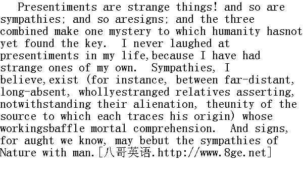 预感真是个怪物!还有感应,还有征兆,都无不如此。三者合一构成了人类至今无法索解的秘密。我平生从未讥笑过预感,因为我自己也有过这种奇怪的经历。我相信心灵感应是存在的(例如在关系甚远、久不往来、完全生疏的亲戚之间,尽管彼此疏远,但都认不有着同一个渊源)。心灵感应究竟如何产生,却不是人类所能理解的。至于征兆,也许不过是自然与人的感应。 When I was a little girl, only six years old, I one night heardBessie Leaven say to Martha Abbot that she had been dreaming about alittle child; and that to dream of children was a sure sign oftrouble, either to one's self or one's kin. The saying might haveworn out of my memory, had not a circumstance immediately followedwhich served indelibly to fix it there. The next day Bessie wassent for home to the deathbed of her little sister. 我还只是一个六岁的小女孩时,一天夜里听见贝茜.利文对马撒.艾博特说,她梦见了一个小孩,而梦见孩子无论对自己还是对亲人,肯定是不祥之兆。要不是紧接着发生的一件事给我留下了难以磨灭的印象,这种说法也许早就淡忘了。第二天贝茜被叫回家去看她咽气的小妹妹。 Of late I had often recalled this saying and this incident; forduring the past week scarcely a night had gone over my couch thathad not brought with it a dream of an infant, which I sometimeshushed in my arms, sometimes dandled on my knee, sometimes watchedplaying with daisies on a lawn, or again, dabbling its hands inrunning water. It was a wailing child this night, and a laughingone the next: now it nestled close to me, and now it ran from me;but whatever mood the apparition evinced, whatever aspect it wore,it failed not for seven successive nights to meet me the moment Ientered the land of slumber. 近来,我常常忆起这种说法和这件事情。因为上个星期,我几乎每晚都在床上梦见一个婴孩。有时抱在怀里哄它安静下来;有时放在膝头摆弄;有时看着它在草地上摸弄雏菊,或者伸手在流水中戏水。一晚是个哭着的孩子,另一晚是个笑着的孩子;一会儿它紧偎着我,一会又逃得远远的。但是不管这幽灵心情怎样,长相如何,一连七夜我一进入梦乡,它便来迎接我。