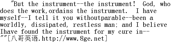 可是途径呢--途径:实施者上帝指定途径。我自己--直截了当地告诉你吧--曾经是个老于世故、放荡不羁、焦躁不安的汉子,现在我相信自己找到了救治的途径,它在于--" He paused: the birds went on carolling, the leaves lightlyrustling. I almost wondered they did not check their songs andwhispers to catch the suspended revelation; but they would have hadto wait many minutes--so long was the silence protracted. At last Ilooked up at the tardy speaker: he was looking eagerly at me. 他打住了。鸟儿唱个不停,树叶飒飒有声。我几乎惊异于它们不刹住歌声和耳语,倾听中止的袒露。不过它们得等上好几分钟--这沉默延续了好久。我终于抬头去看这位吞吞吐吐的说话人,他也急切地看着我。" "Little friend," said he, in quite a changed tone--while his facechanged too, losing all its softness and gravity, and becoming harshand sarcastic--"you have noticed my tender penchant for Miss Ingram:don't you think if I married her she would regenerate me with avengeance?"" 小朋友,"他说,完全改了口气--脸色也变了,失去了一切温柔和庄重,变得苛刻和嘲弄-一"你注意到了我对英格拉姆小姐的柔情吧,要是我娶了她,你不认为她会使我彻底新生吗?" He got up instantly, went quite to the other end of the walk, andwhen he came back he was humming a tune. 他猛地站了起来,几乎走到了小径的另一头,走回来时嘴里哼着小调。" "Jane, Jane," said he, stopping before me, "you are quite pale withyour vigils: don't you curse me for disturbing your rest?"" 简,简,"他说着在我跟前站住了,"你守了一夜,脸色都发白了,你不骂我打扰了你的休息?"
