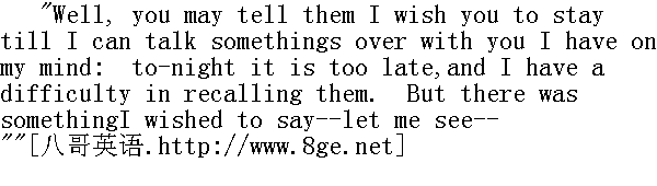 好吧,那你可以告诉她们,我希望你呆着,直到我能谈谈一些我心里想着的事情。今天夜里已经太晚了,而且回忆起来有困难。不过有些事情我很想说--让我想想看--"