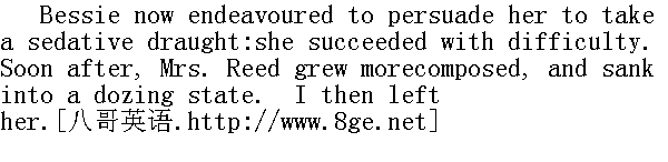 此刻,贝茜竭力劝她服用镇静剂,费了好大劲才说服她。里德太太很快镇静下来了,陷入了昏睡状态,随后我便离开了她。