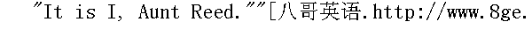 是我,里德舅妈。" "Who--I?" was her answer. "Who are you?" looking at me withsurprise and a sort of alarm, but still not wildly. "You are quitea stranger to me--where is Bessie?"" 谁--我?"她回答。"你是谁?"她诧异地看着我,颇有些吃惊,但并没有失去控制。"我完全不认识你--贝茜呢?" "She is at the lodge, aunt."" 她在门房,舅妈。" "Aunt," she repeated. "Who calls me aunt? You are not one of theGibsons; and yet I know you--that face, and the eyes and forehead,are quiet familiar to me: you are like--why, you are like JaneEyre!"" 舅妈!"她重复了一声。"谁叫我舅妈来着?你不是吉卜森家的人,不过我知道你--那张面孔,那双眼睛和那个前额,我很熟悉。你像--唉,你像简.爱!" I said nothing: I was afraid of occasioning some shock by declaringmy identity. 我没有吭声,怕一说出我的身份会引起某种震惊,