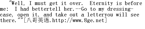 可是,"她说,"恐怕这是个错觉,我的想法欺骗了我。我很想看看简.爱,我想象出跟她相似的地方,但实际并不存在,况且八年当中她的变化一定很大,"这时我和气地让她放心,我就是她设想中的人。见她明白我的意思,头脑也还镇静,我便告诉她,贝茜如何派丈夫把我从桑菲尔德叫来。" "I am very ill, I know," she said ere long. "I was trying to turnmyself a few minutes since, and find I cannot move a limb. It is aswell I should ease my mind before I die: what we think little of inhealth, burdens us at such an hour as the present is to me. Is thenurse here? or is there no one in the room but you?"" 我的病很重,这我知道,"没有多久她说"几分钟之前,我一直想翻身,却发觉四肢都动弹不得。也许我没有死就该安下心来。健康时我们想得很少的事,在眼下这样的时刻,却成了我沉重的负担。护士在吗?房间里除了你,没有别人吗?" I assured her we were alone. 我让她放心只有我们两个。 "Well, I have twice done you a wrong which I regret now. One was inbreaking the promise which I gave my husband to bring you up as myown child; the other--" she stopped. "After all, it is of no greatimportance, perhaps," she murmured to herself: "and then I may getbetter; and to humble myself so to her is painful."" 唉,我两次做了对不起你的事,现在很懊悔。一次是违背了我向丈夫许下的,把你当作自己孩子抚养成人的诺言。另一次--"她停住了。"也许这毕竟无关紧要。"她喃喃地自言自语说:"那样我也许会好过些,但是,向她低声下气实在使我痛苦。" She made an effort to alter her position, but failed: her facechanged; she seemed to experience some inward sensation--theprecursor, perhaps, of the last pang. 她挣扎着要改变一下她的位置,但没有成功。她的脸变了形。她似乎经历着某种内心的冲动--也许是最后一阵痛苦的先兆。