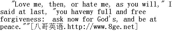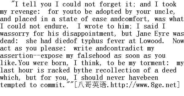 写信的时间是三年之前。 "Why did I never hear of this?" I asked." 为什么我从来没有听说过这回事?"我问。 "Because I disliked you too fixedly and thoroughly ever to lend ahand in lifting you to prosperity. I could not forget your conductto me, Jane--the fury with which you once turned on me; the tone inwhich you declared you abhorred me the worst of anybody in theworld; the unchildlike look and voice with which you affirmed thatthe very thought of me made you sick, and asserted that I hadtreated you with miserable cruelty. I could not forget my ownsensations when you thus started up and poured out the venom of yourmind: I felt fear as if an animal that I had struck or pushed hadlooked up at me with human eyes and cursed me in a man's voice.--Bring me some water! Oh, make haste!"" 因为我对你的厌恶已经根深蒂固,因此不愿意帮助你发迹。我忘不了你对我的举动,简--你一度冲我而发的火气;你说你在世上最讨厌我时的腔调;你声言一想起我就使你恶心、我待你很冷酷时丝毫不像孩子的神情与口气。我也忘不了你惊跳起来,把心头的一腔毒气喷吐出来时,我自己的感受。我觉得害怕,仿佛我打过推过的动物,用人一样的目光瞧着我,用人一样的嗓门儿,诅咒我--拿些水来!唉,快点!" "Dear Mrs. Reed," said I, as I offered her the draught she required,"think no more of all this, let it pass away from your mind.Forgive me for my passionate language: I was a child then; eight,nine years have passed since that day."" 亲爱的里德太太,"我把她要的水端给她时说,"别再想这些了,你就忘了它吧,原谅我那些激烈的言词,当时我还是个孩子,现在八、九年已经过去了。" She heeded nothing of what I said; but when she had tasted the waterand drawn breath, she went on thus - 她对我说的话毫不理会。不过喝了水,透过气来后,她又继续说:
